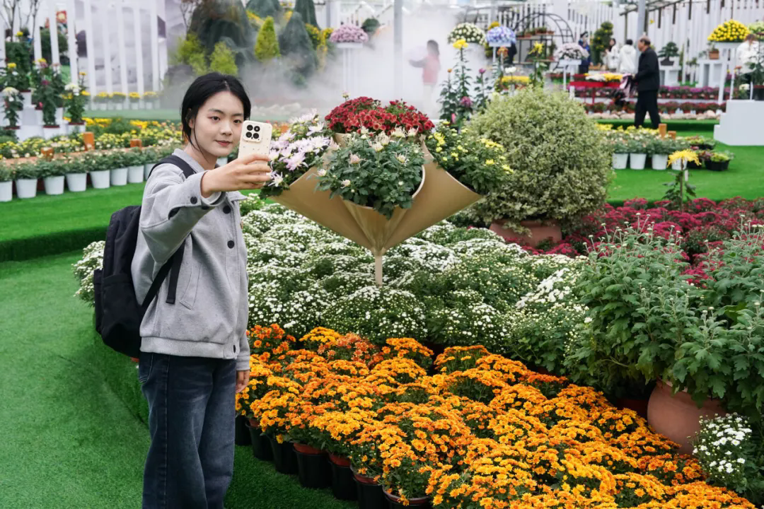 2025年10月18日,游客在全椒菊博园展厅与菊花盆栽合影。杜宇摄(新华社)