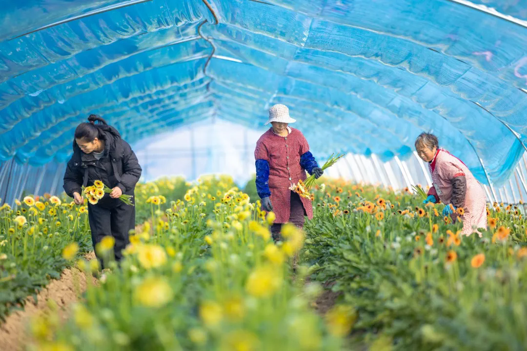 2025年12月25日,江苏省宿迁市泗洪县界集镇曹庙社区一鲜花种植基地里,花农忙着采收非洲菊,供应市场。李佳摄(中经视觉)