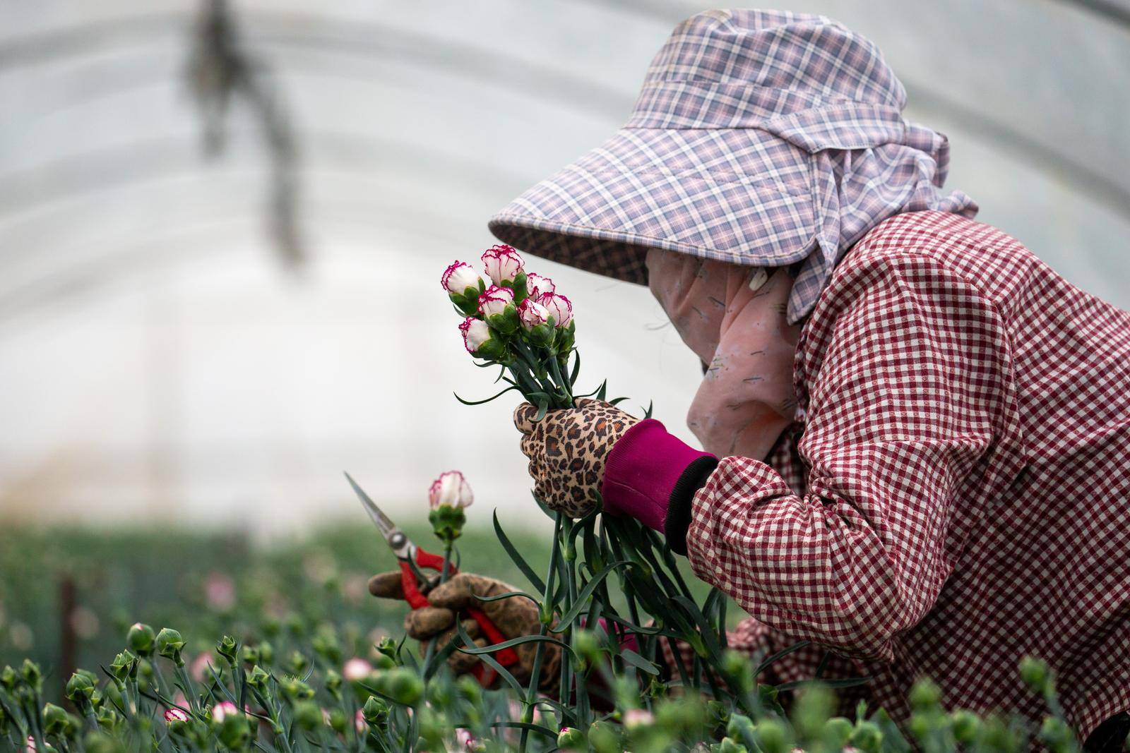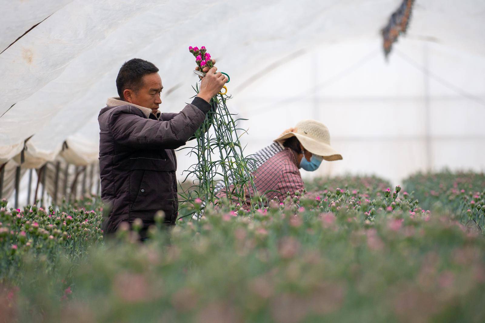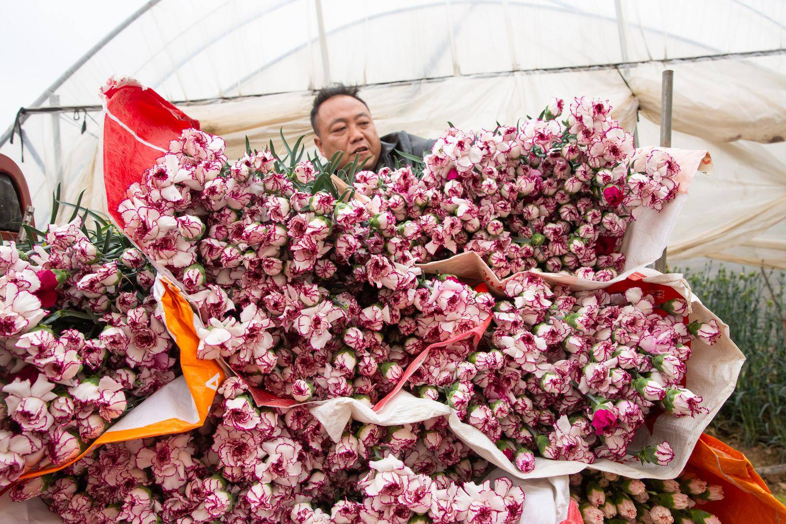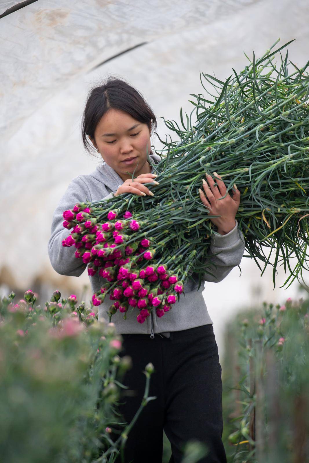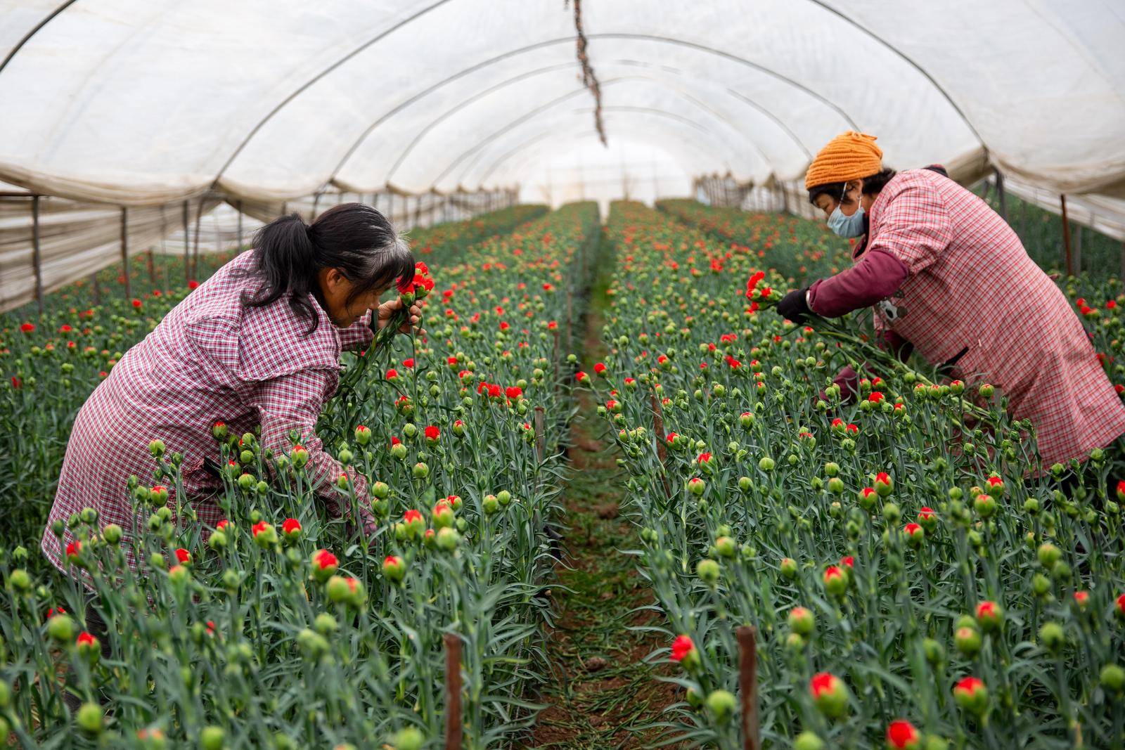 清晨6点,盘江镇的花卉大棚里已是人声鼎沸。花农王大姐手持修枝剪,对准花茎利落一剪,一支花苞饱满的康乃馨便落入怀中,随手放入腰间的花筐。“春节订单排得满,每天天不亮就开工,一天要采收、打包近万枝鲜花。”她一边麻利地捆扎花束,一边笑着说,这些鲜切花经过分级、保鲜处理后,将由冷链车直发昆明斗南花卉市场,再销往全国各大城市,成为市民家中的新春装点。